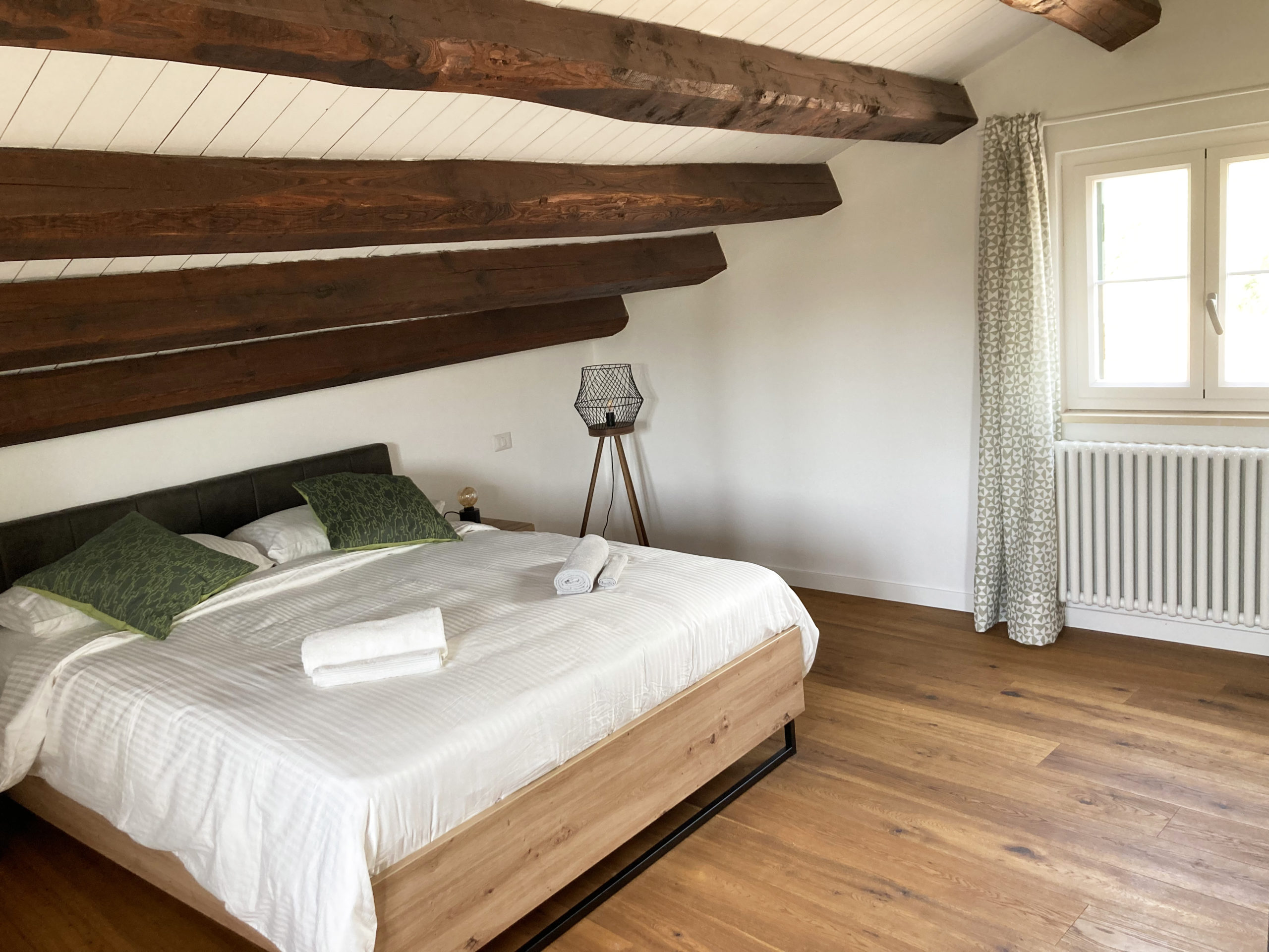 La suite Pineta de 28m2 est idéale pour une famille de quatre personnes. L’ameublement de la suite est un mélange harmonieux de design moderne et de détails traditionnels tels que les poutres apparentes en châtaignier et le plancher en chêne.